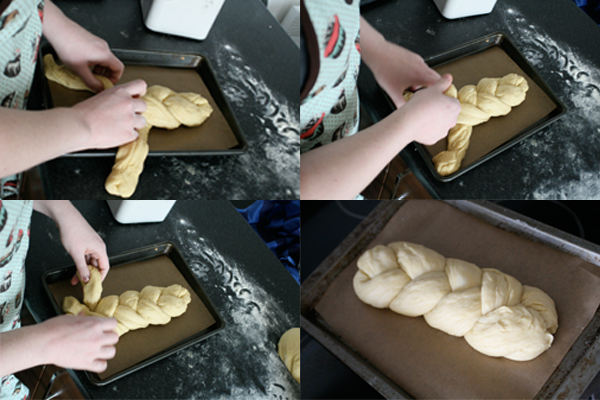 7. Divide the dough into four pieces, then cut each of these pieces into thirds. (I find it’s easiest to use a pizza cutter for this, as it slices through much more easily than a knife. I also weighed the dough to be sure that everything was even.) Roll each of the pieces into a 12-inch rope and braid three pieces of rope together, pinching the ends together and tucking underneath the loaf to seal it up. (See the photos above.) Place each of the braided loaves onto a baking sheet lined with baking parchment.