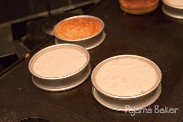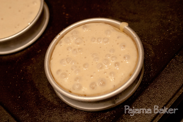 5. Pour 4 Tablespoons of your batter into each ring. After a couple minutes, bubbles will start to appear on the top (like you see with American pancakes) and the surface will set up. Once this happens, flip your crumpet and the ring over and cook on the other side for another 3 minutes until golden.