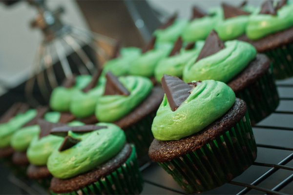 6. Transfer your frosting to a piping back and pipe onto the cupcakes as you’d like. Top each cupcake with half of a chocolate mint to add a finishing touch!